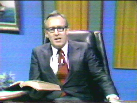 The Pastor’s Desk was a daily devotional vignette featuring guest pastors from around the Los Angeles area. The guest pastor would tape a week of messages that would be aired near the end of the broadcast day on KHOF-TV. Pictured on the right is Rev. Bob Bloom, guest pastor.
