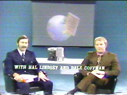 One of the early specials produced at FBN was with Hal Lindsey. Hal was interviewed about his new book he had authored, The Late Great Planet Earth. On a technical note you will see the slide projector projecting the book on a screen. This was before many of the modern day techniques used in the production of television programs today. Pictured is Hal Lindsey on the left and the program host, Dale Coffman an FBN staff member.