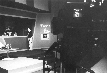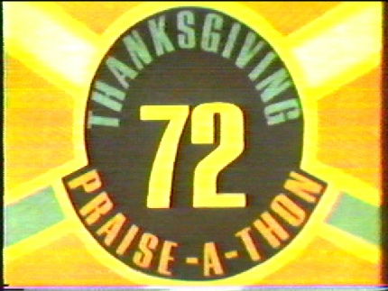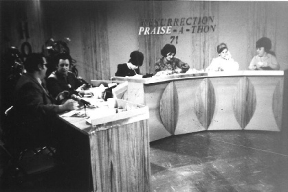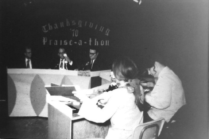 Graphic of the 1972 Thanksgiving Praise-A-Thon. Paul Calentine, former General Manager, remembers this interesting fact about the set seen in the following pictures. “It came from KTLA's production studio and was believed to have been used for the ‘Liar's Club Show.’ This caused a little stir when it arrived at Faith Center, but was transformed with some new paint to become the Praise-A-Thon set for a couple years. It gave some of us a laugh but also reminded us to tell the truth whenever we were on air.”