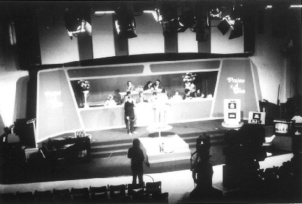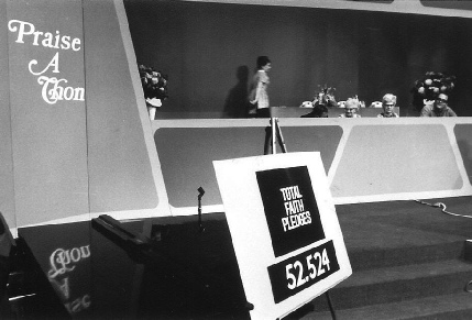 Later Praise-A-Thons were conducted in the main auditorium of Faith Center. Shown is the set constructed on the platform with the television cameras on the main floor. The moveable chairs used for church services are seen in the lower left.