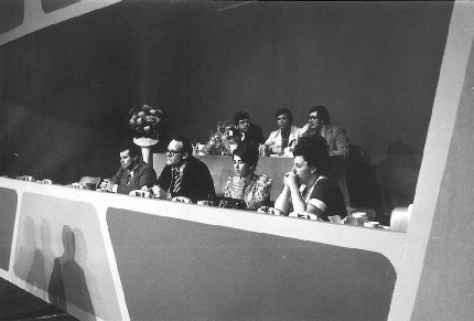 Thanksgiving Praise-A-Thon of 1971. Seated at the main desk left to right is Dr. Willard Peirce, Pastor Ray Schoch and Paul Calentine. In the foreground answering phones are Frankie Cardoza (L) and Pat Manning (R). This Praise-A-Thon was held in the small studio on the 3rd floor of the Faith Center office building. The studio later housed the set for Black Buffalo’s Pow-Wow, a daily kids show on KHOF-TV.