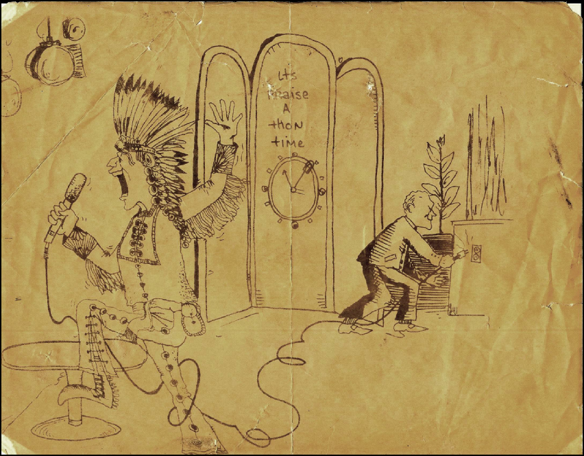 The co-hosts for one of the Praise-A-Thons were Ray Wilson, known to kids as Black Buffalo, and Willard Cantelon. Ray is of American Indian descent and quite a showman. He rarely lacked for words. And, likewise, Willard was a well known speaker that rarely lacked for anything to say. During this telethon they seemed to constantly be upstaging each other in jest and grabbing the microphone. The staff found this humorous and the FBN artist created this drawing showing Willard “Pulling the Plug” on Ray’s microphone. The precise year this was drawn is unknown but it is estimated to be circa 1973.