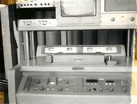 A view of the 2” tape deck is on the left. The large 2” videotape reels were placed on the reel hubs (one is shown on the left on the deck top). The picture monitor is shown on the middle of the bridge above the deck. An audio speaker is on the right of the bridge and a waveform monitor used when adjusting video levels is on the left side of the bridge.