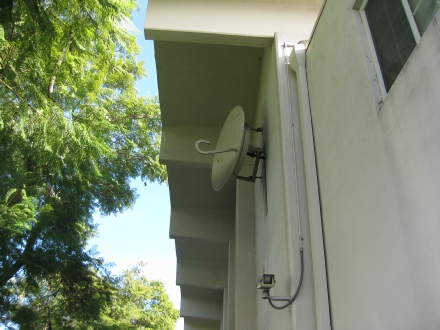 A photo taken in 2012 showing the 4 foot microwave antenna at Faith Center on the north side of the auditorium. The antenna is aimed at the Bekins building.