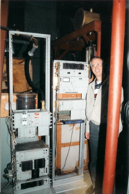 Joe Snelson is standing next to some of the old Lenkurt microwave radio equipment. This gear was removed from service and stored at the KHOF-TV transmitter site. The photo was taken in 1998.