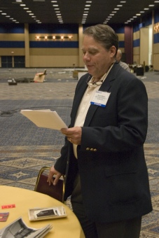 Byron Mobus looking at a KHOF-TV-FM brochure