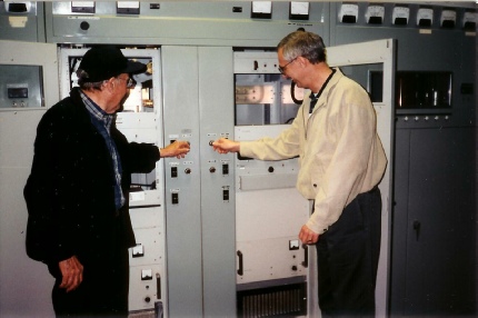 This is another angle showing the heat exchanger to the left and the back of the transmitter to the right. Joe and Bernie are examining some of the high voltage electrical disconnect switches against the north wall. Transformers just outside the building from these panels stepped 480 volts up to 18 thousand volts required to operate the klystron tube.