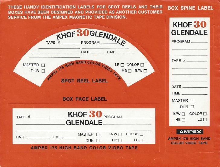 Not only was AMPEX in the VTR machine manufacturing business, they also manufactured and sold audio and videotape. FBN purchased quite a bit of videotape stock from AMPEX. As an added value, AMPEX provided the labels shown above. Each sheet of labels consisted of reel and box labels.