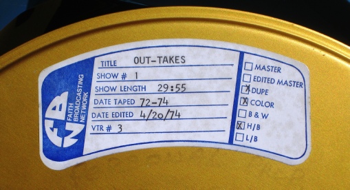 Below are some memorabilia from the mid 1970 era at FBN. These are the customized labels that were placed on the videotape reels and their protective boxes. Labels would provide information such as program name, program number, the recorded date, length. Other information might include whether it was a master tape or a duplicate, the recording standard used and machine number used for recording.